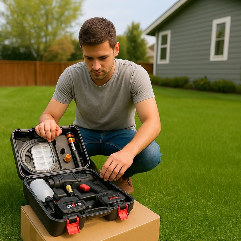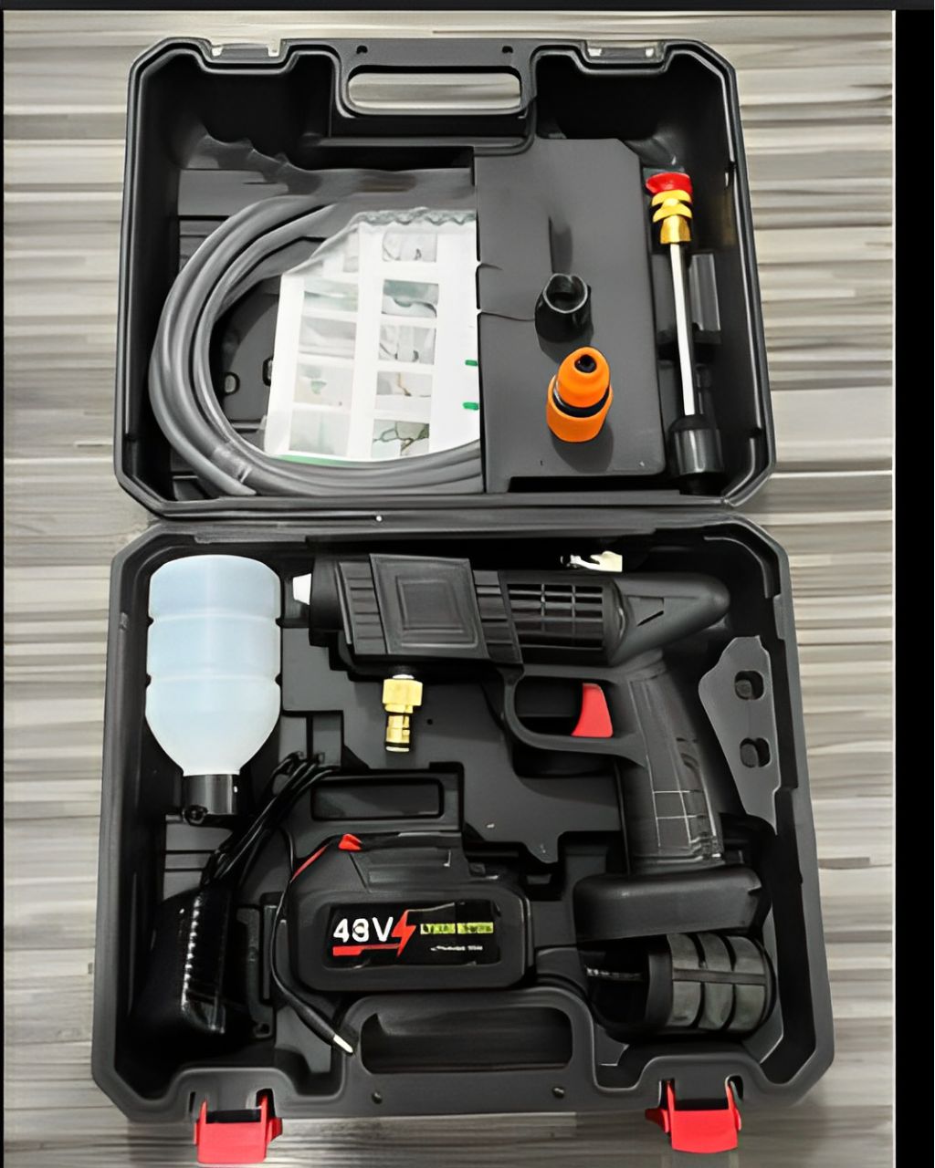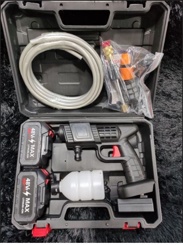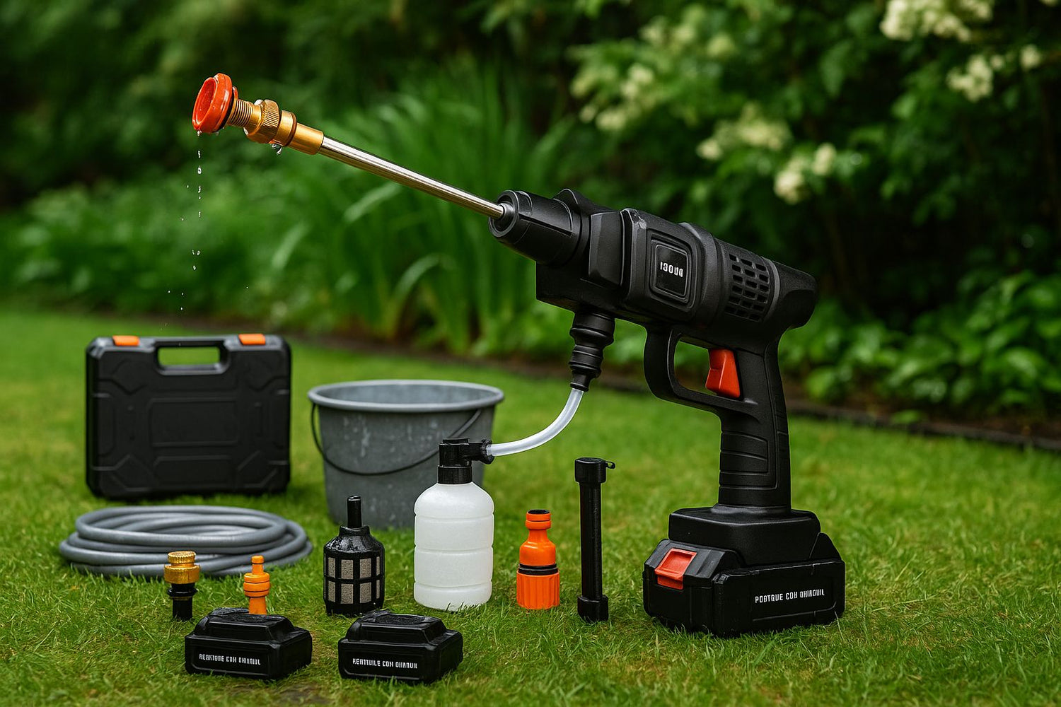 Recibirás la hidrolavadora inalámbrica, 2 baterías recargables, cargador, manguera, filtro, boquillas intercambiables y botella de espuma. Todo dentro de un práctico maletín portátil.