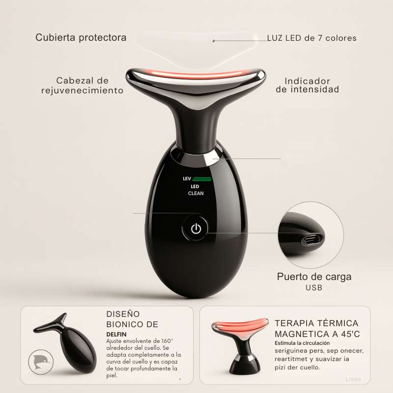 Diseño ergonómico tipo delfín para rostro y cuello |